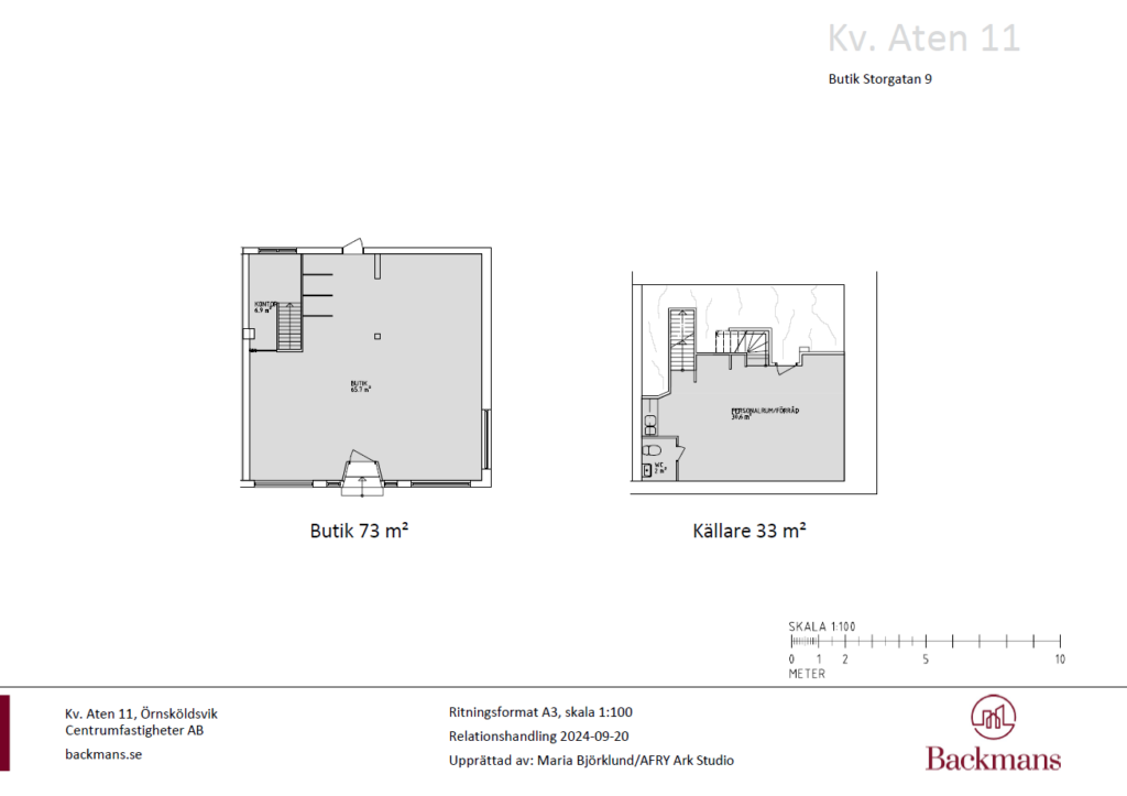 Lager och personalutrymmen med pentry och WC finns i källarplan med nedgång från butiken 33 m2.